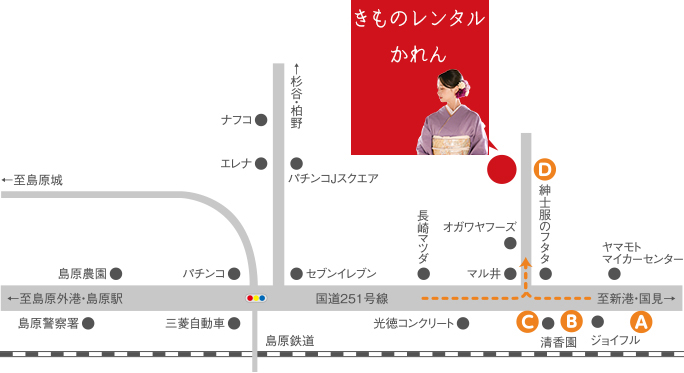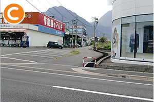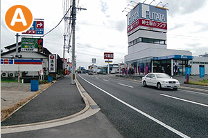 「紳士服のフタタ」さんと「作業服の丸丼」さんとの間の道を通ります。